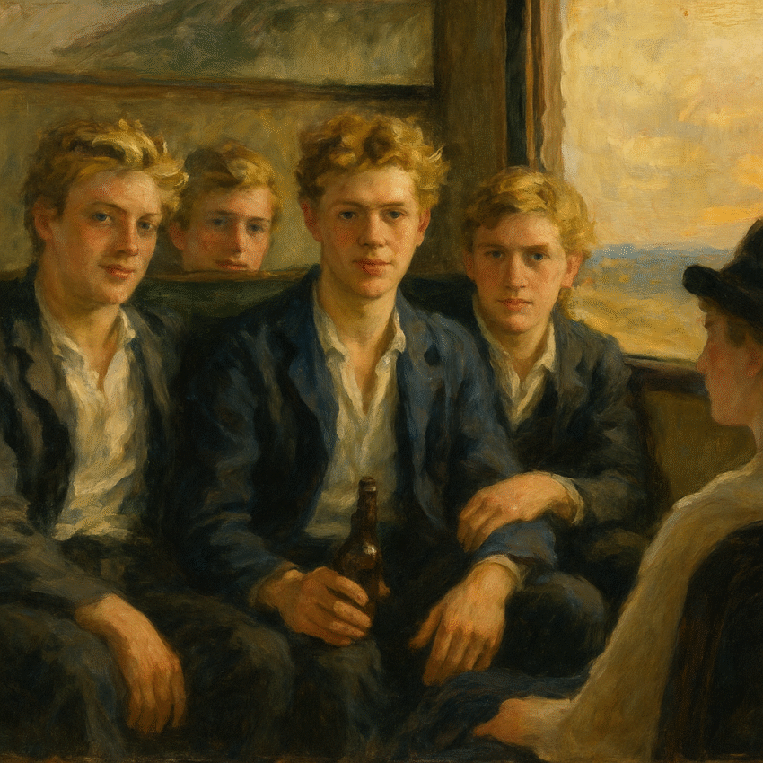Ik zat in de trein en in het zitje links tegenover me hing een groepje studenten. Twintigers, nog maar net, brallend en bier drinkend. Scherpe kaaklijnen, dikke lokken glanzend blond haar. Om de beurt gluurden ze verlekkerd naar mijn lichaam. Zoals jonge mannen doen.