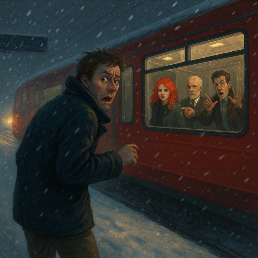 Er leek geen einde aan de rode trein te komen. De vreemde gesticulerende snuiter in de trein liep steeds sneller en geïntrigeerd bleef Jaap hem gadeslaan. Hoe lang stond hij nu al naar hem te kijken? Plotseling hoorde hij een fluit. Hij keek op en zag het informatiebord. Verhip, zijn trein was gewijzigd naar spoor 1! Gehaast draaide hij zich om, maar zijn trein naar Klokdam had de deuren al gesloten en gleed langzaam de sneeuwstorm in.