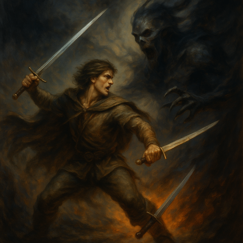 Mijn zwaarden waren uit hun houders en vastberaden stapte ik over het spiezenveld. Twee dofrode ogen volgden mijn nadering en een diep gerommel waarschuwde me afzijdig te blijven. Zonder plichtplegingen sloeg ik de daimon in een dozijn stukken.